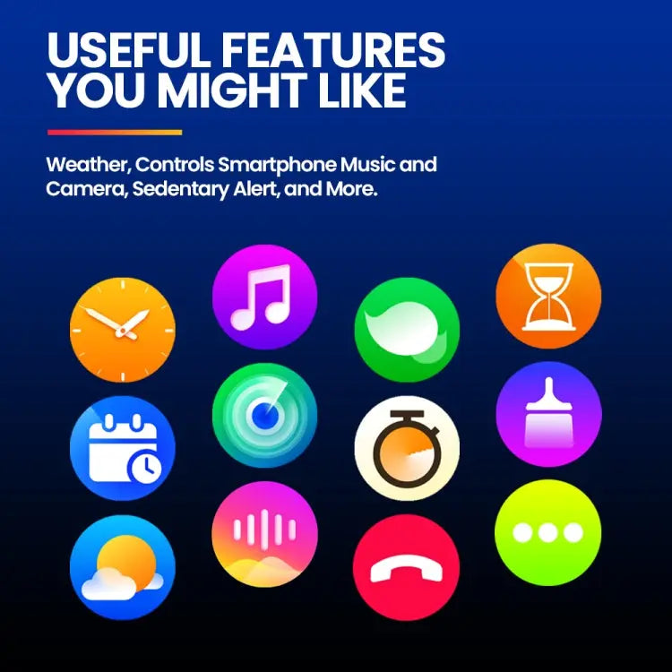 13. Daily Smart Features: Smart Notifications(Call, Text, Gmail, and Smartphone App Notifications), Weather Sync, Controls Smartphone Music and Camera, Find My Phone and Watch, Do Not Disturb Modes, Sedentary alert, Drink water reminder, Calendar, Calculator, Business Card, APP Download.