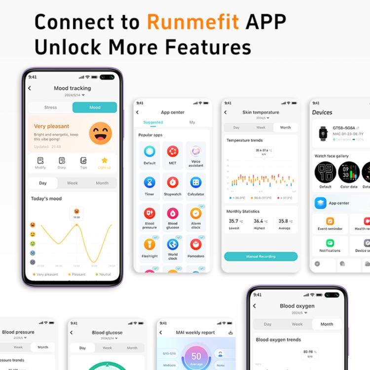 15. Functions: MAl Health Management, 100+ Sports Modes, Activities, Bluetooth Calling, One-tap Measure, Heart Rate, Stress, Blood Oxygen, Sleep monitoring, Breathe training, MET,Weather, Notifications, Music Control, Timer, Stopwatch, Calculator, Alarm, Flashlight, Find My Phone, etc.