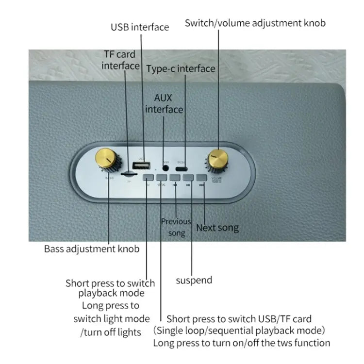 7. Playback mode: Bluetooth, TF card, U disk, audio input